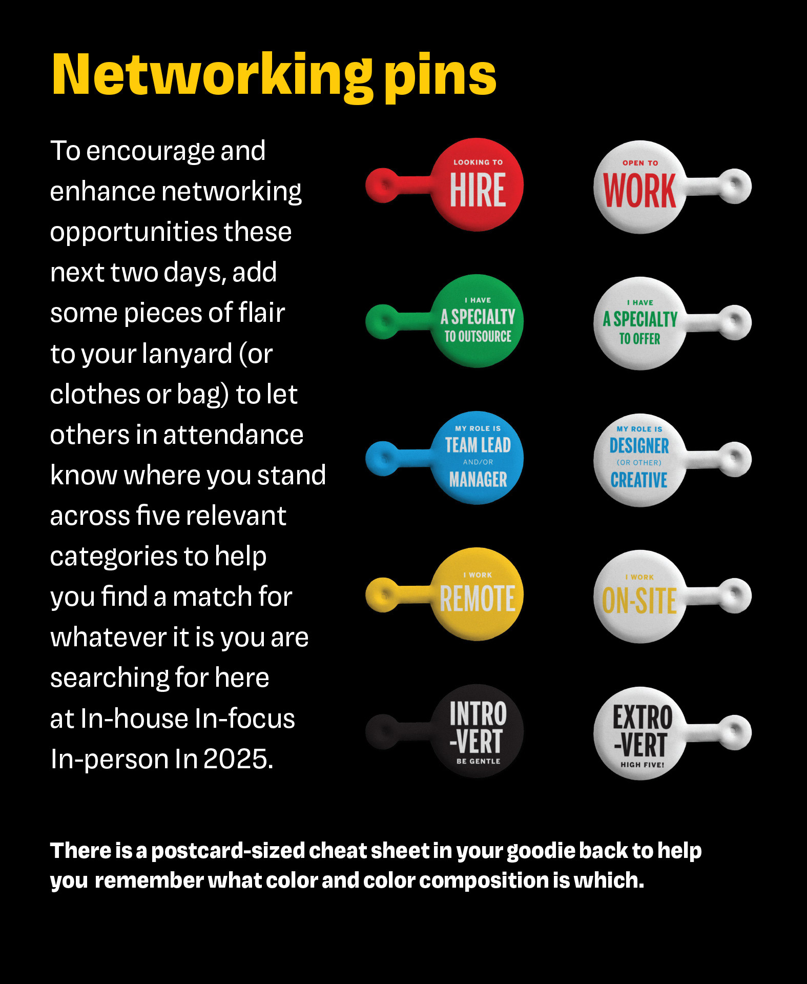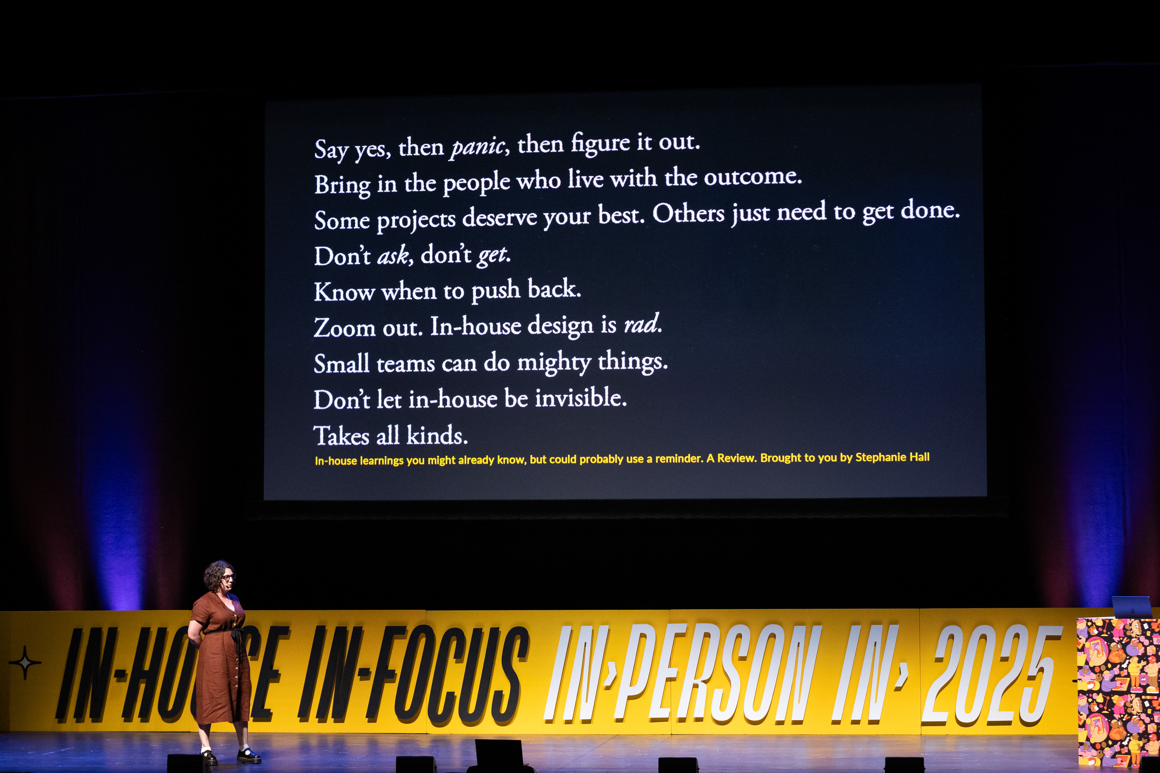 In-house In-focus In-person, an event by UnderConsideration LLC, is a two-day conference highlighting the array of experiences possible at design, communication, and brand in-house teams from around the world and their impact on their organization’s goals.